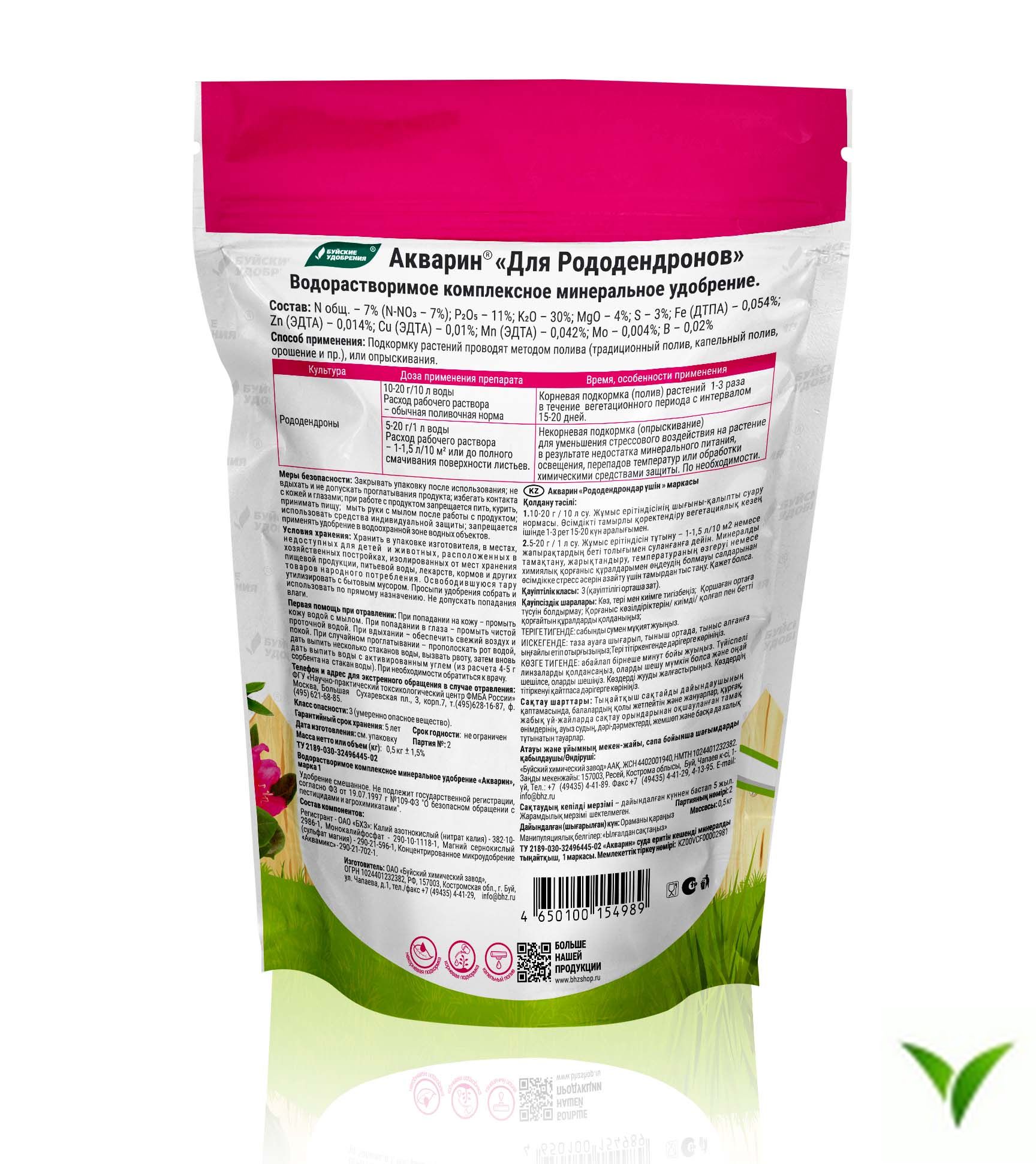 Акварин для Рододендронов – водорастворимое удобрение, в состав которого входит азот, фосфор, калий, магний, сера и микроэлементы – железо, цинк, марганец, медь в хелатной форме, а бор и молибден – в минеральной. Благодаря кислой реакции (рН) удобрения, оно легко растворяется в холодной воде и более эффективно усваивается корневой системой или листовой поверхностью растений.