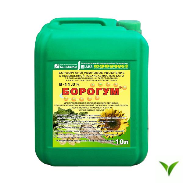 Борогум кроме эффективного борного питания обладает ярко выраженными имунно и ростостимулирующими свойствами, значительно повышает коэффициент использования питательных веществ в почве и удобрений, что обеспечивает увеличение урожайности сельскохозяйственных культур, особенно: сахарной свеклы, подсолнечника, картофеля.
