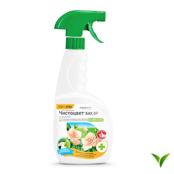Чистоцвет эффективно подавляет грибные заболевания растений: ржавчину, черную пятнистость, мучнистую росу. Препарат имеет защитные, лечебные и иммунизирующие свойства, не смывается дождем, устойчив к неблагоприятным погодным условиям. Препаративная форма: ВР – водный раствор.