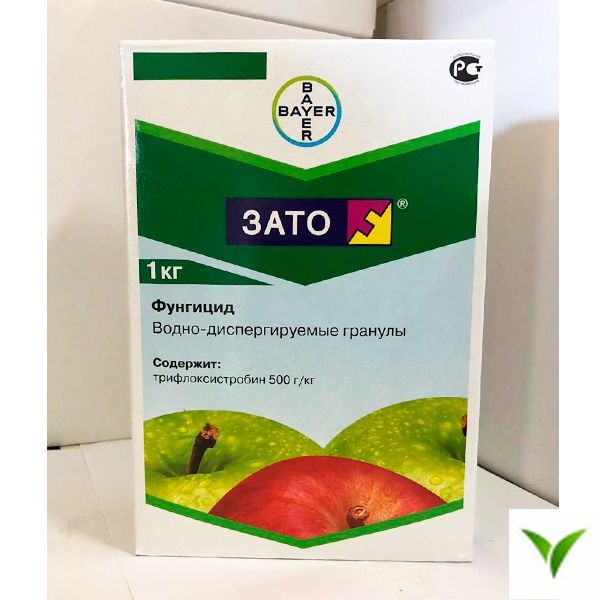 Зато® — фунгицид, обладающий мезостемным действием, которое выражается в закреплении фунгицида на поверхности листьев и плодов за счет связывания с восковым слоем, а также трансламинарной активности, что обеспечивает длительную, не зависящую от погодных условий защиту от заболеваний. Трифлоксистробин подавляет митохондриальное дыхание в грибах, что приводит к прекращению роста и гибели. Фунгицид обладает защитным и лечебно-профилактическим действием.